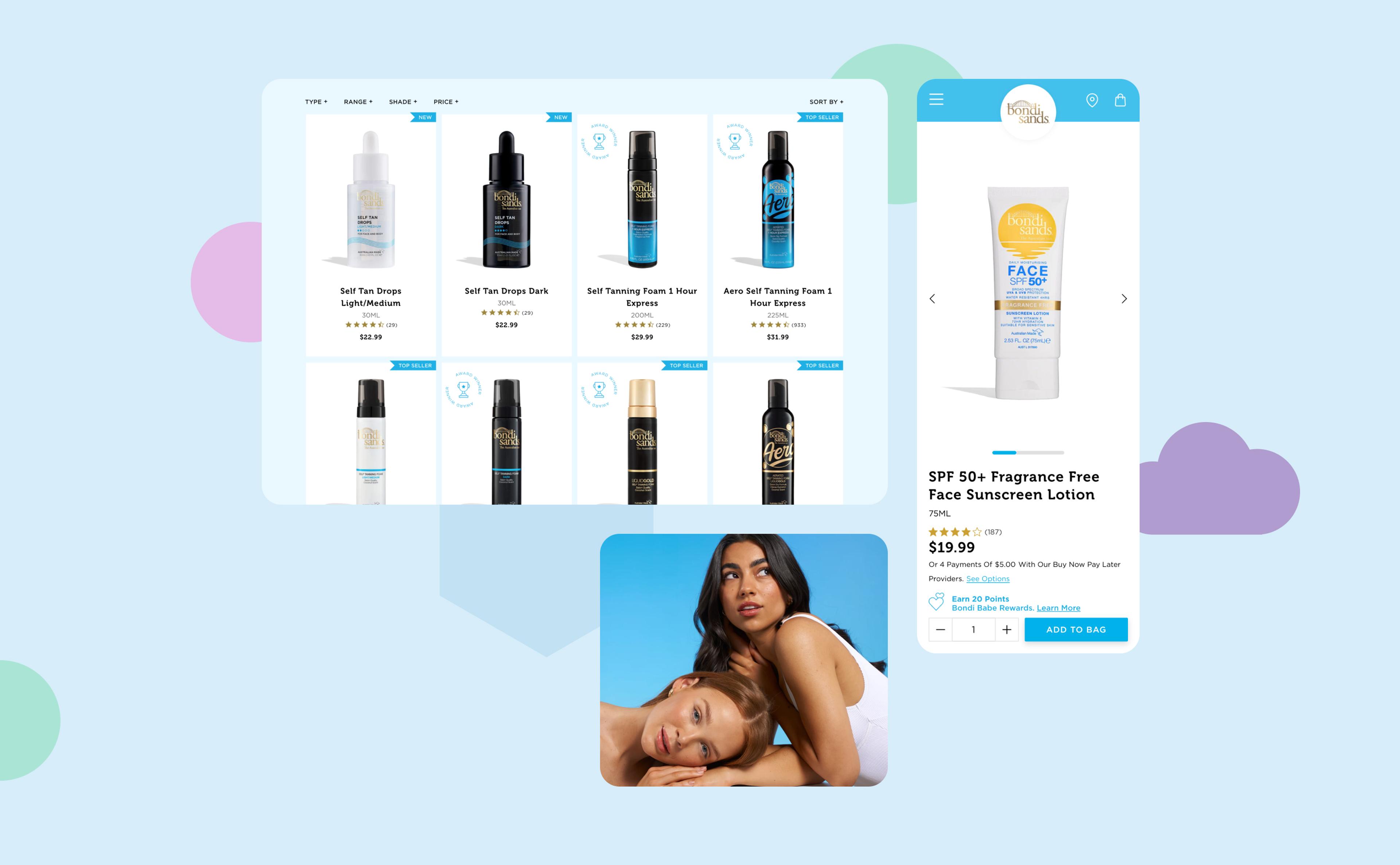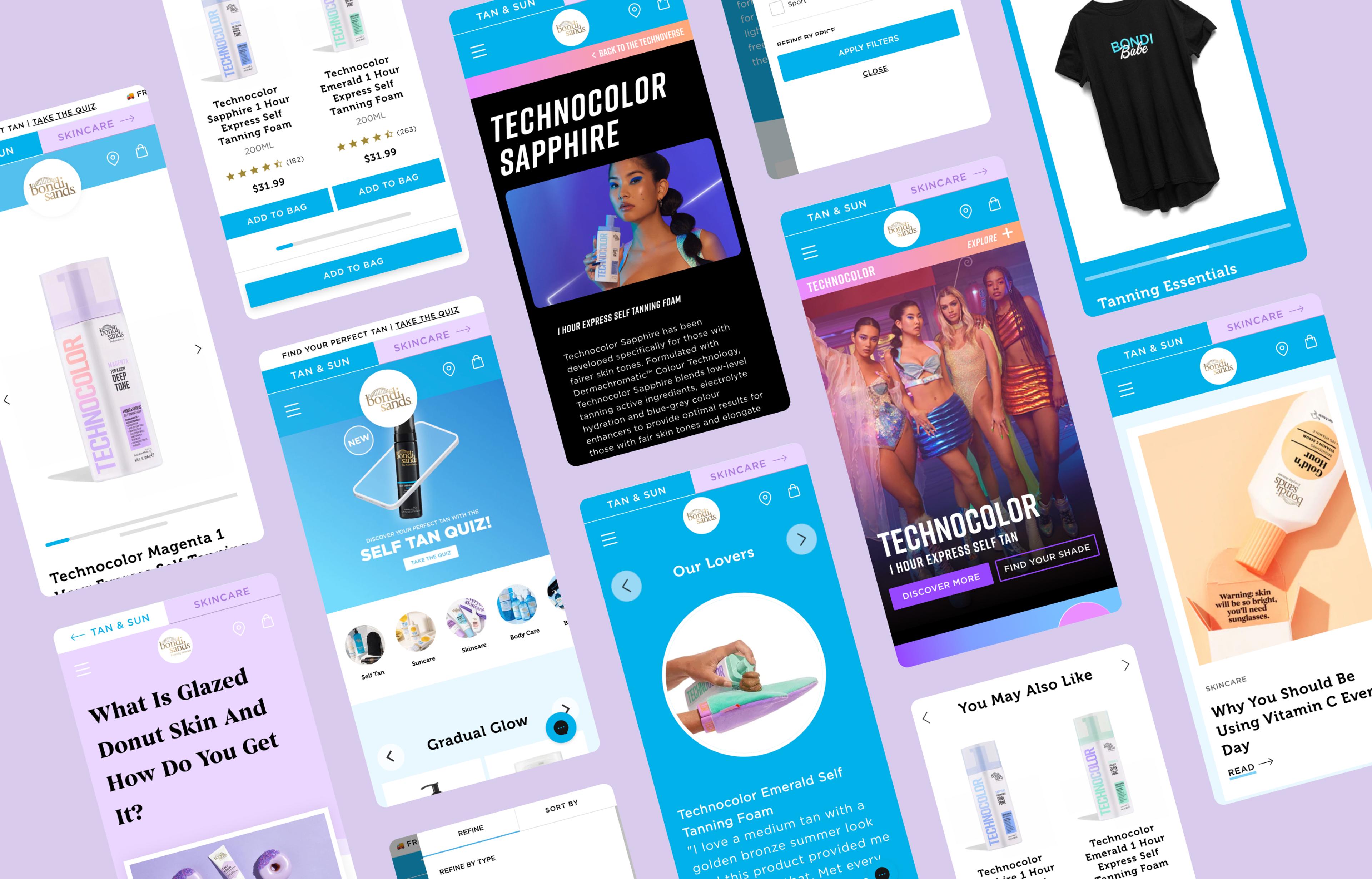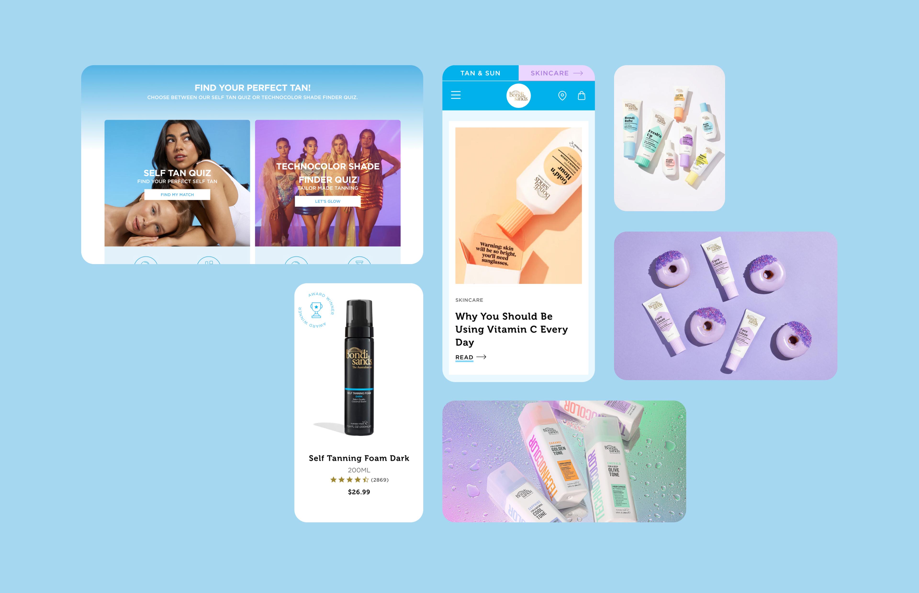 | Product Finder | With an expanding product line, customers found it increasingly difficult to locate the exact products they needed. We collaborated with the Bondi Sands team to create tailored quizzes: a Self-Tan Quiz, Shade Finder Quiz, and Skin Quiz. These guided shopping experiences make it easier for customers to find the perfect products, improving conversion rates and providing invaluable data for marketing and product development. |