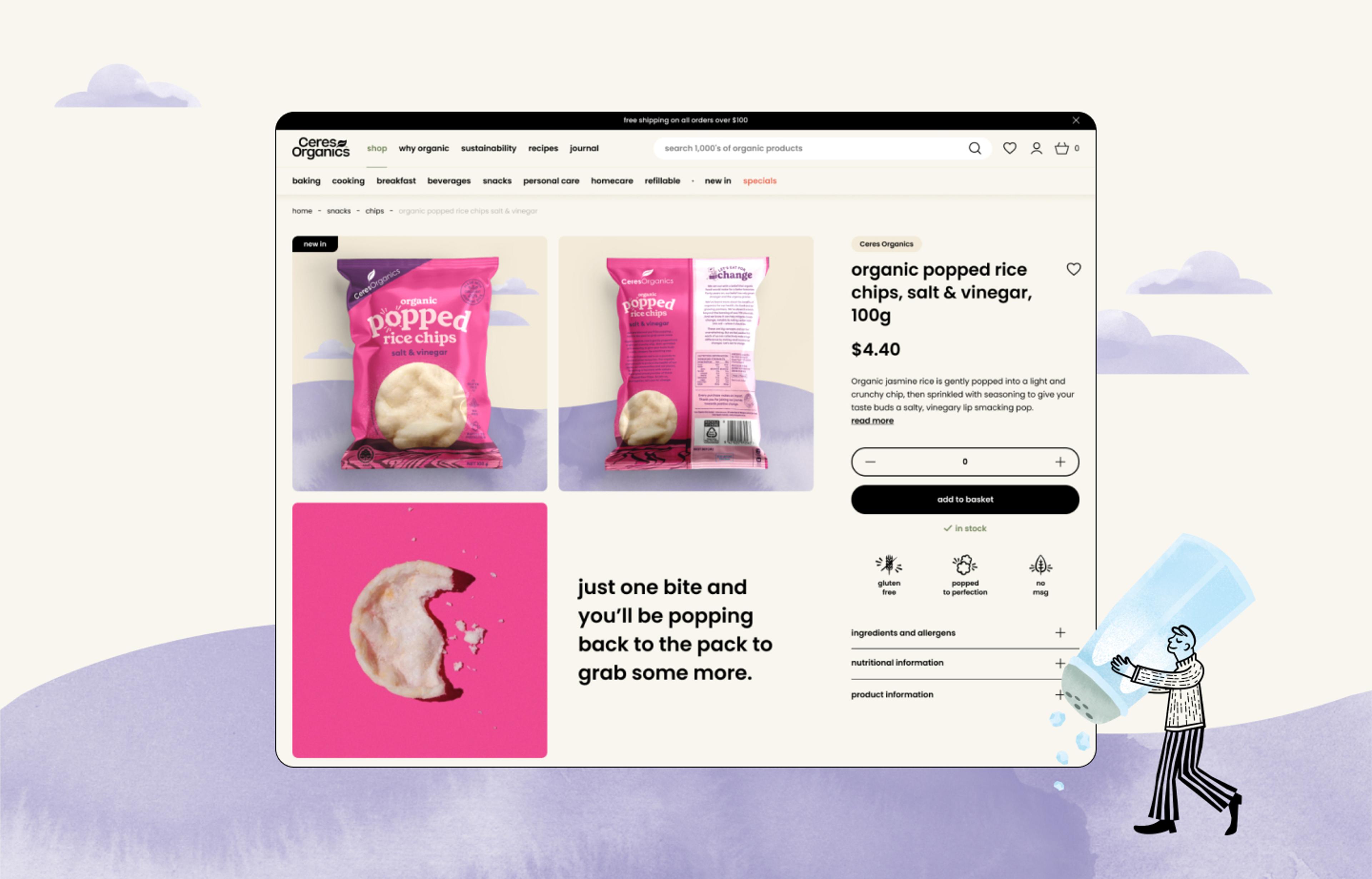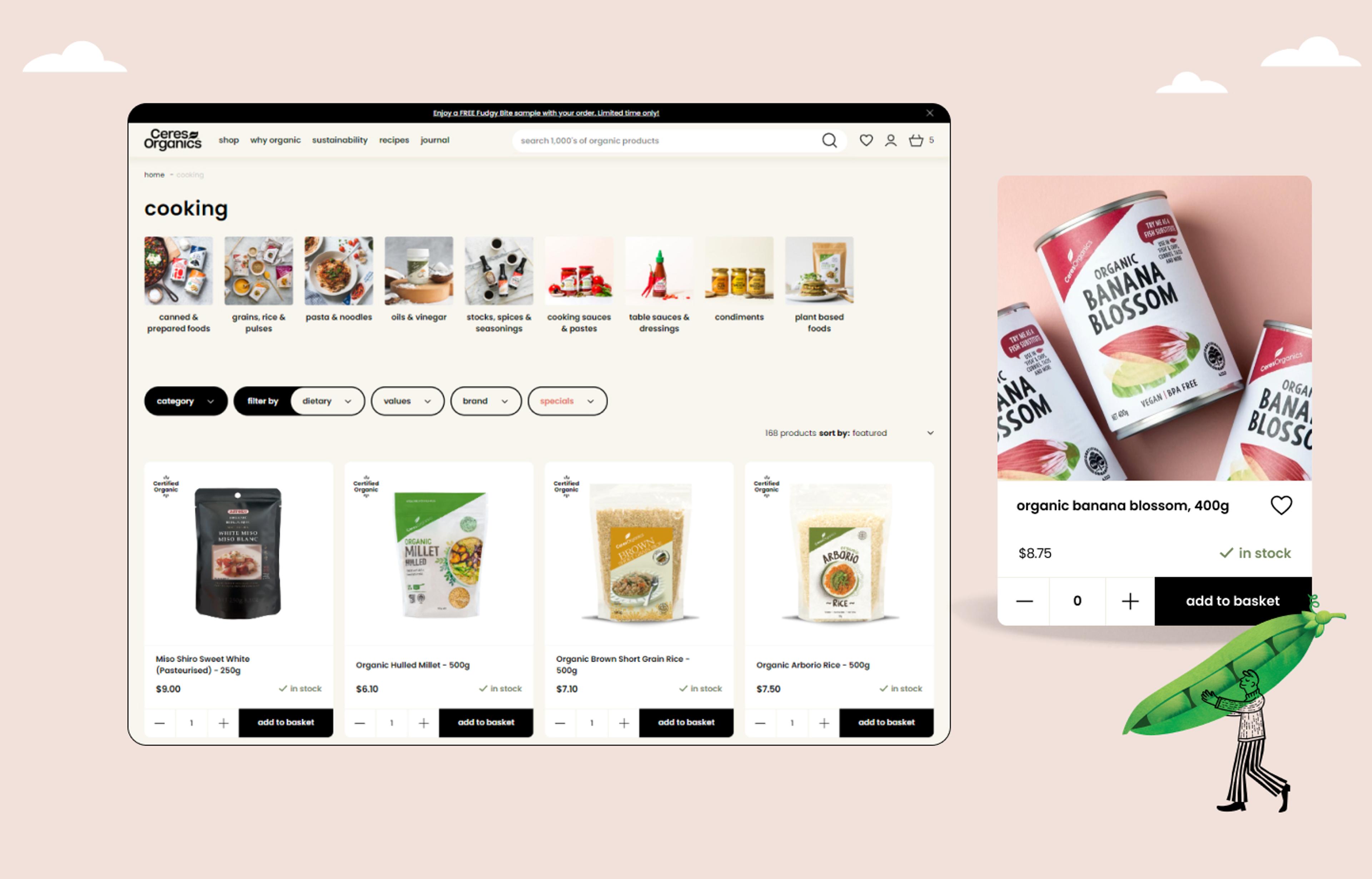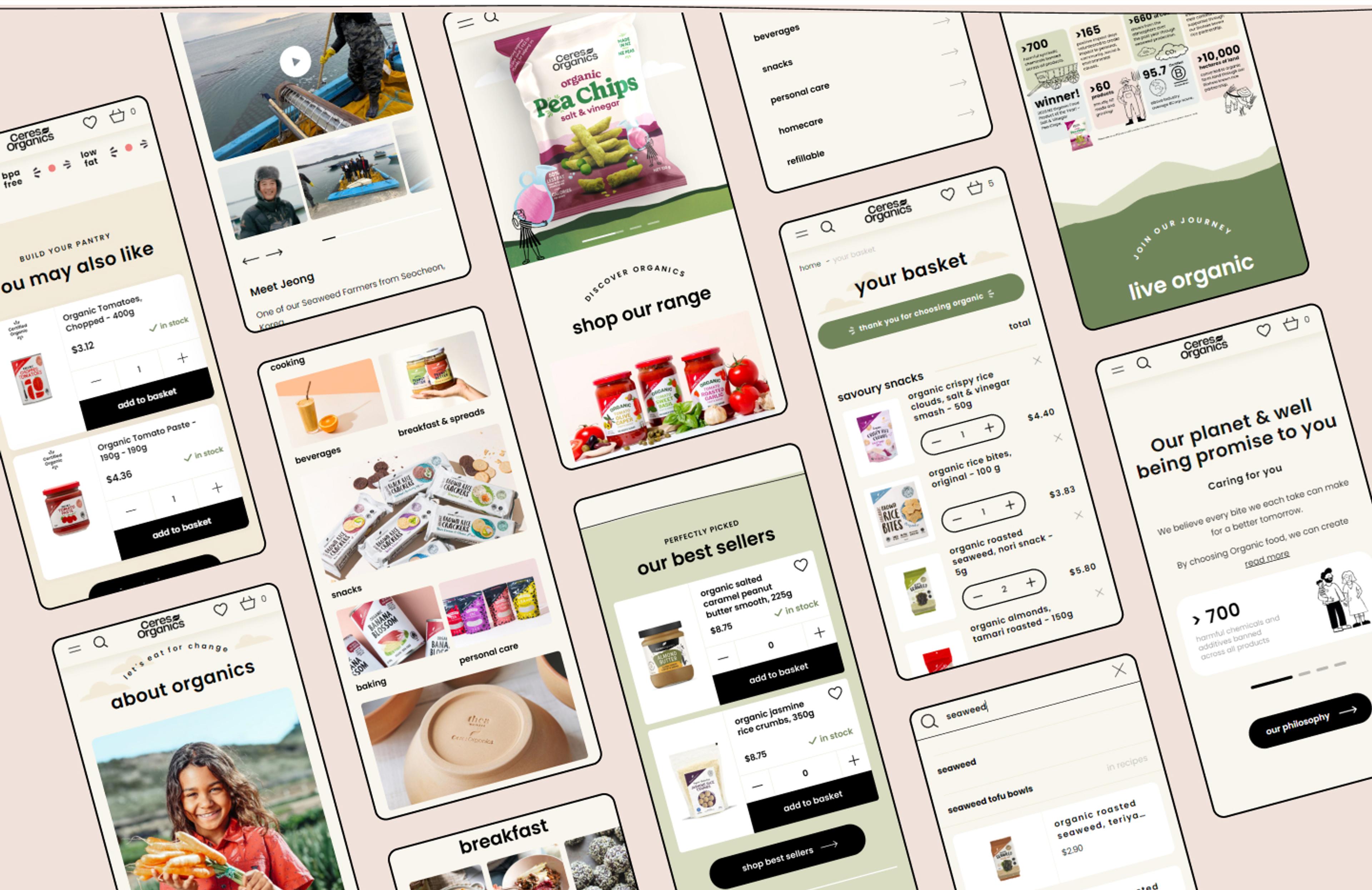 | UI/UX Design | Moustache Republic tailored the UI/UX to showcase Ceres Organics’ unique branding and streamlined the user journey for grocery shoppers. This included a robust search and filtering system and a product listing page where customers can add products directly, making the shopping experience smooth and efficient. |